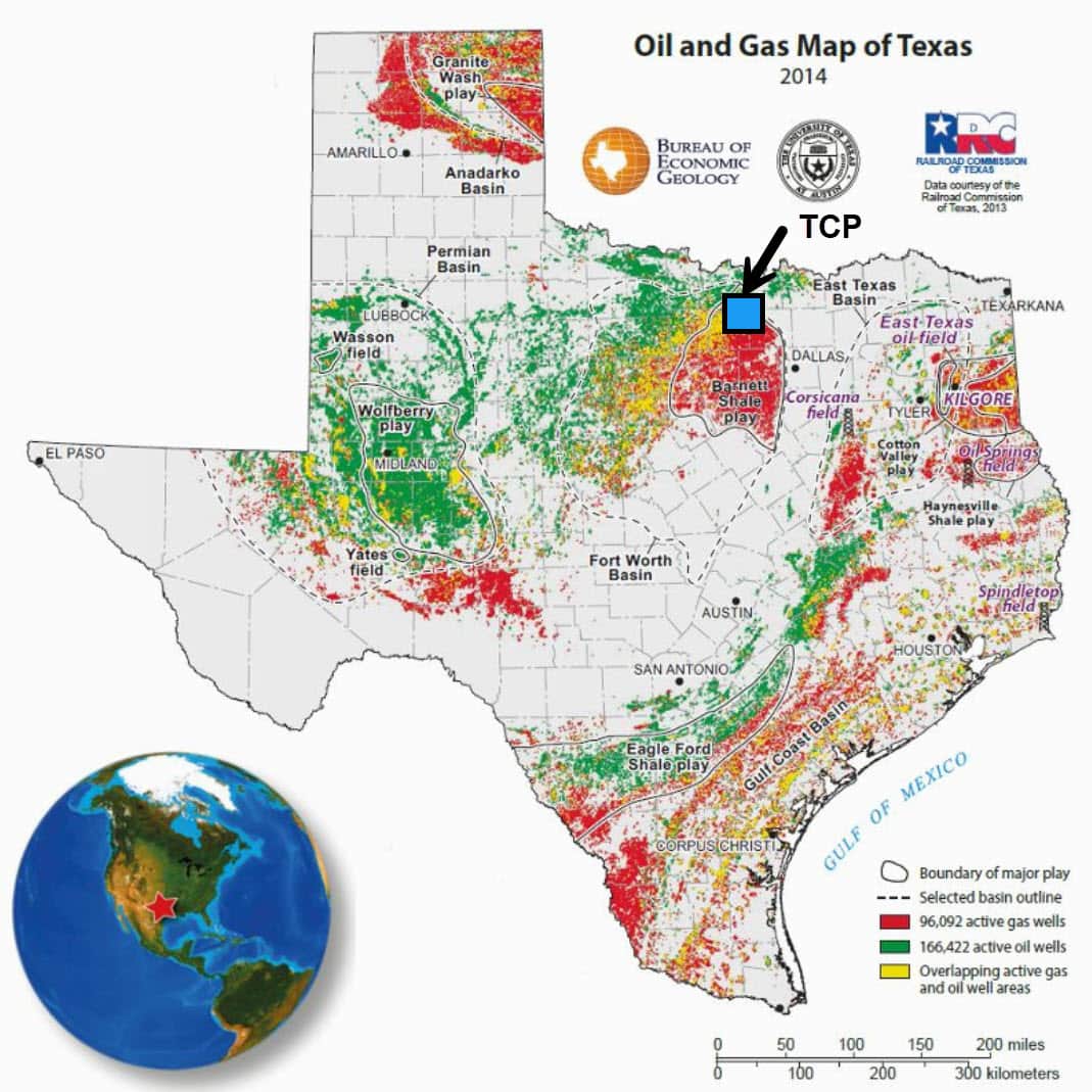 Oleum’s Triple Combo project (TCP) is located in the northeastern portion of the Fort Worth Basin (FWB) and the Barnett play. The TCP is a re-development project exploiting Proved Reserves in the Barnett Shale. The project consists of >3,500 acres in the “sweet spot” of the FWB with the thickest and highest reservoir quality Barnett in the basin, at the juncture of the Oil and Wet Gas portions of the basin.